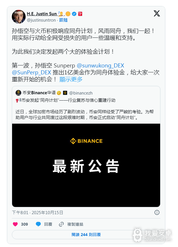 紧接着,在10月15日稍晚,波场(TRON)创始人、HTX(前火币)掌门人孙宇晨在X平台发布公告,宣布孙悟空DEX和火币HTX交易所将积极响应币安的“同舟计划”,两大平台将各自推出1亿美元的体体验金计划,合计2亿美元,为全网加密用户提供“重新开始的机会”。